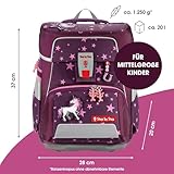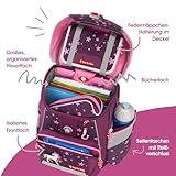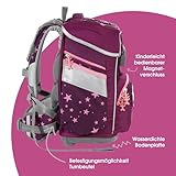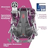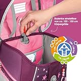 Das belüftete Rückenpolster ist ergonomisch geformt und passt sich gut der Wirbelsäule an. Mittels Brustgurt und breiten Hüftflossen (Hüftgurt) sitzt die Schultasche fest auf dem Kinderrücken, ohne zu wackeln oder zu drücken. Die Tragegurte sind mit ca. 5cm ausreichend breit. Damit lässt sich der Ranzen - auch wenn er schwer ist - bequem auf den Schultern tragen, ohne dass er einschneidet.